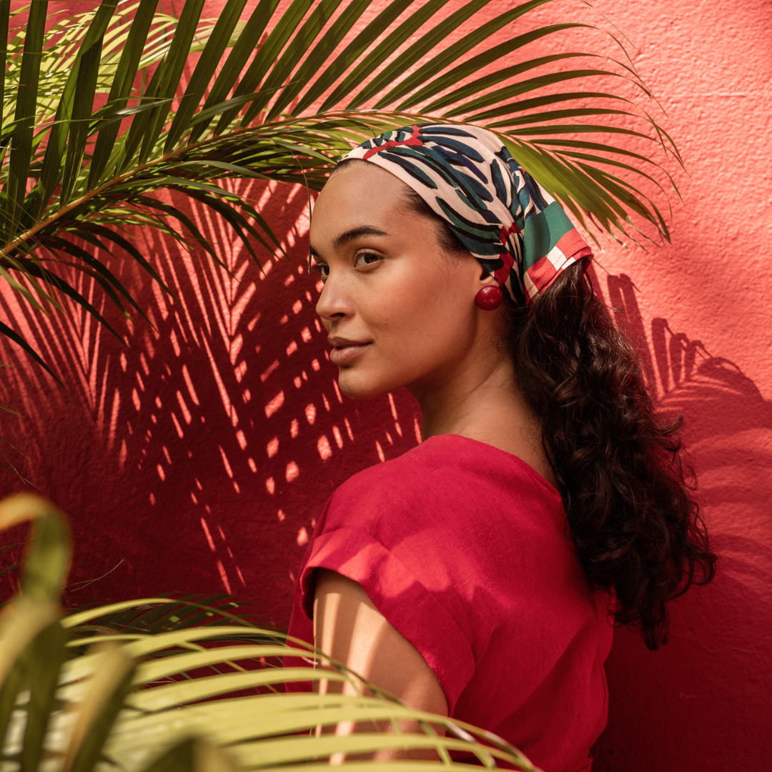 Uma das formas clássicas de uso do lenço é usando ele na cabeça. Você pode variar as amarrações, como bandana, turbante, faixa de cabelo ele orna maravilhosamente bem ✨