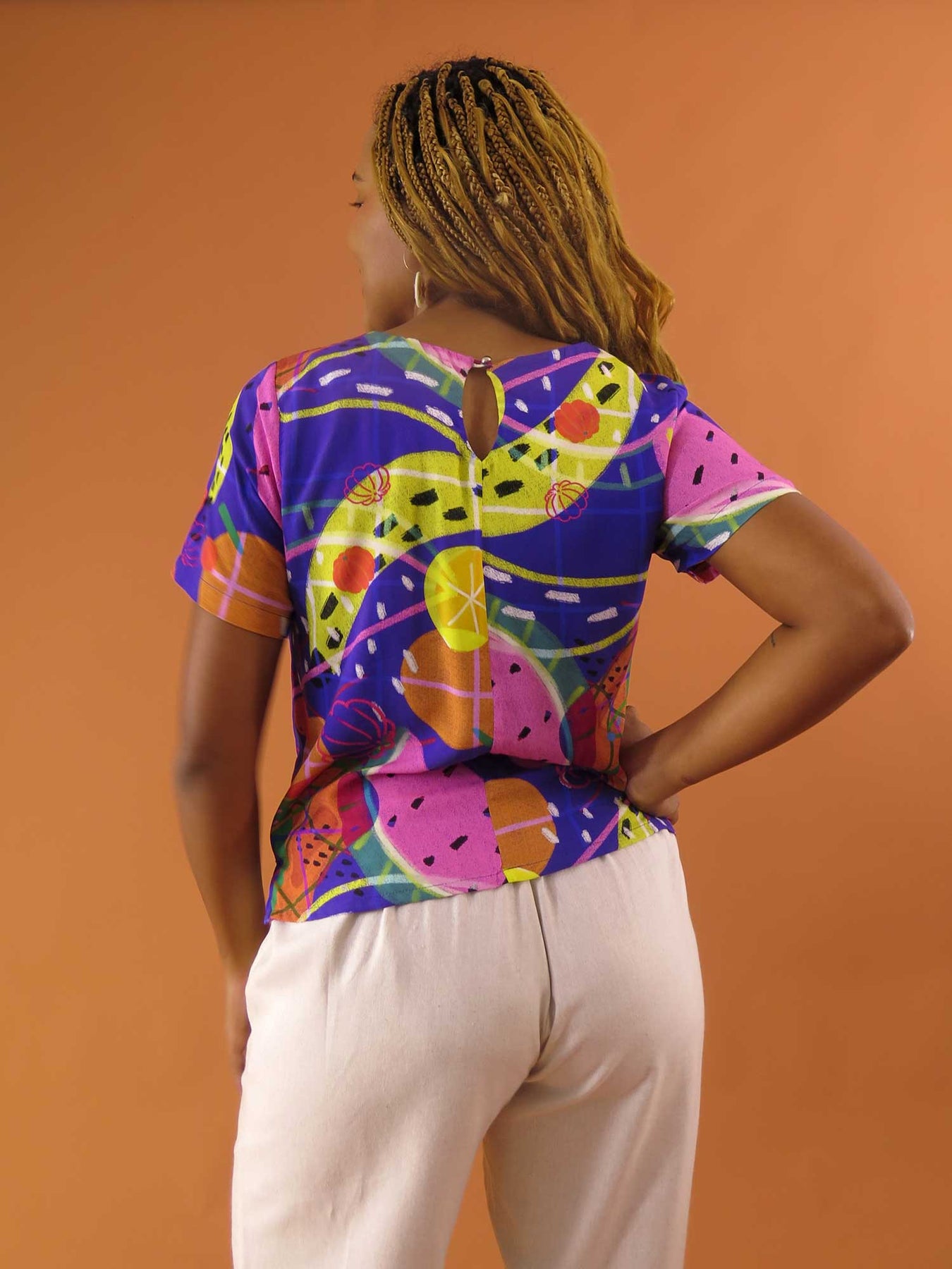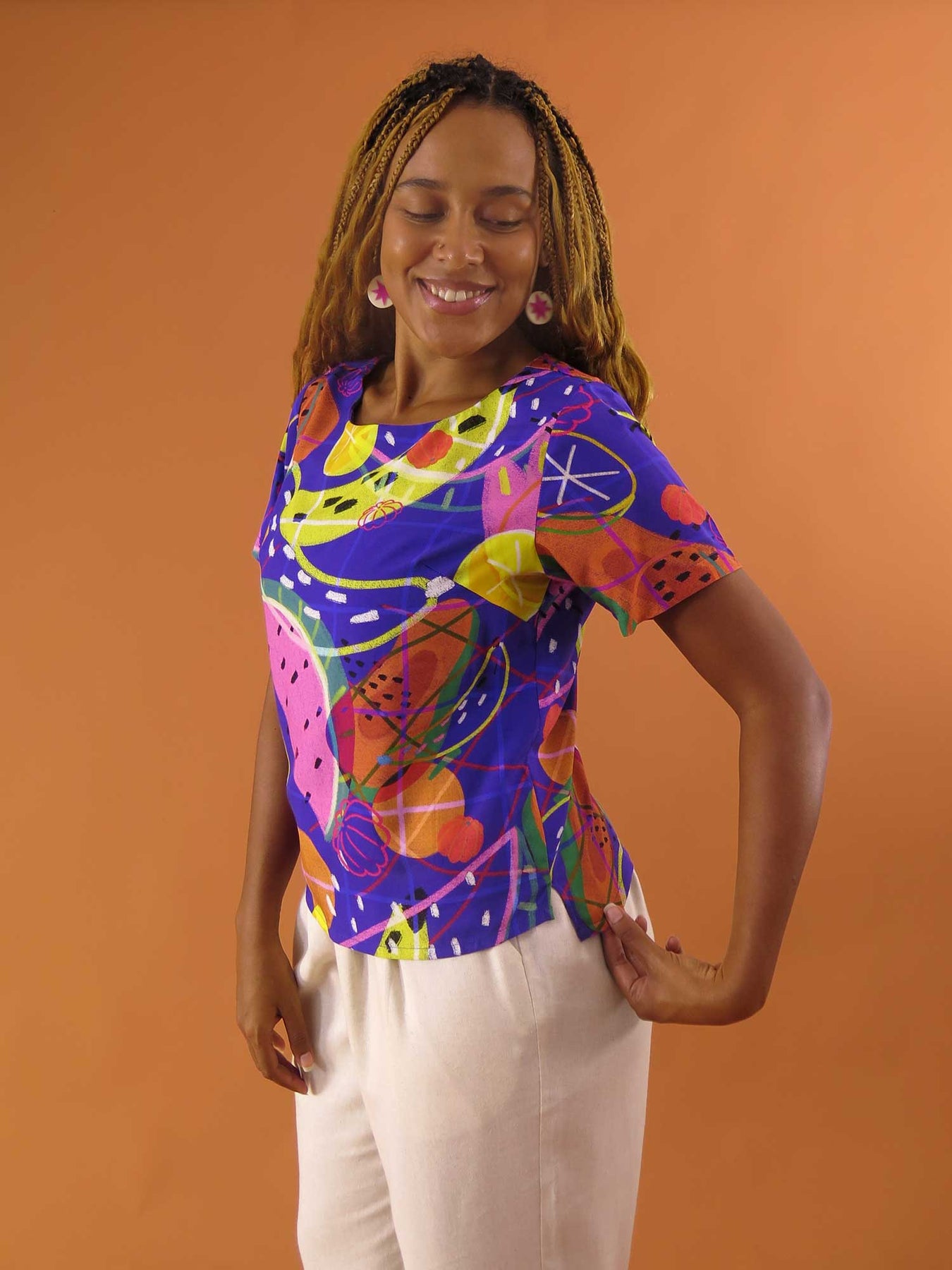 Ela foi feita especialmente para nossos dias de calor e mesa cheia. Com desenhos de frutas da primavera/verão do Brasil, e cores vibrantes no fundo azul. Perfeita para um mix de estampa com Piquenique ou como você quiser usar.