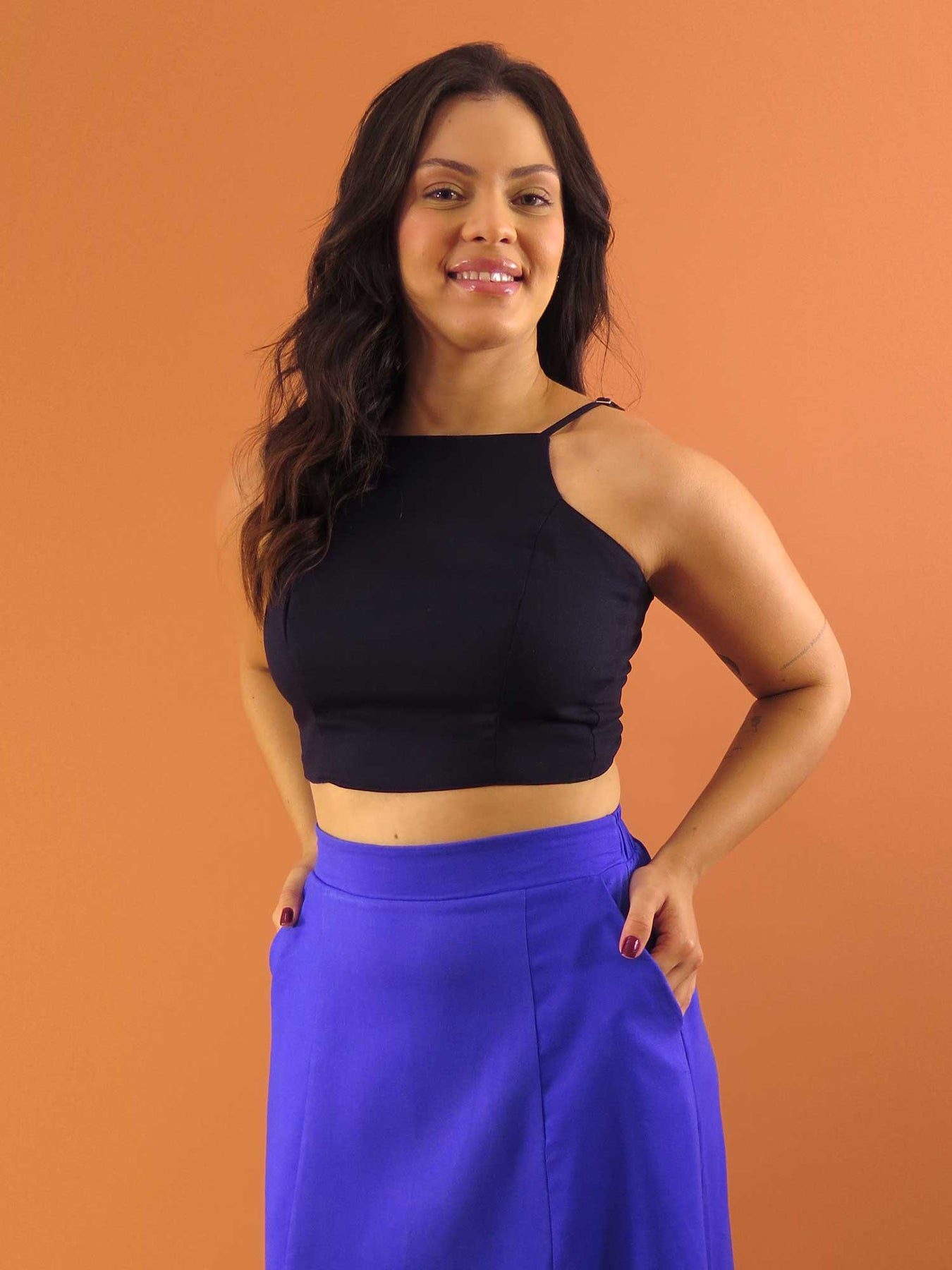 A modelo tem 81 cm de busto x 59 cm de cintura x 90 cm de quadril. Mede 172 cm de altura e veste tamanho PP