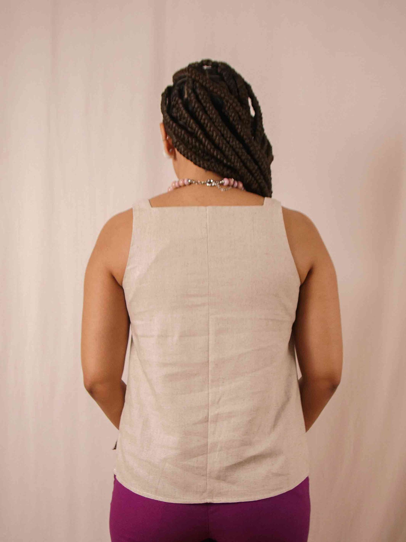 Nossa regata de linho é perfeita para quem ama peças com um corte mais reto. Tem uma modelagem simples e confortável e cai super bem para o dia a dia. Ela tem decote reto e alça larga que possibilita o uso com sutiã, a parte é de trás é um pouco maior pra deixar mais confortável. Você pode usar ela por dentro ou por fora de uma peça cintura alta.