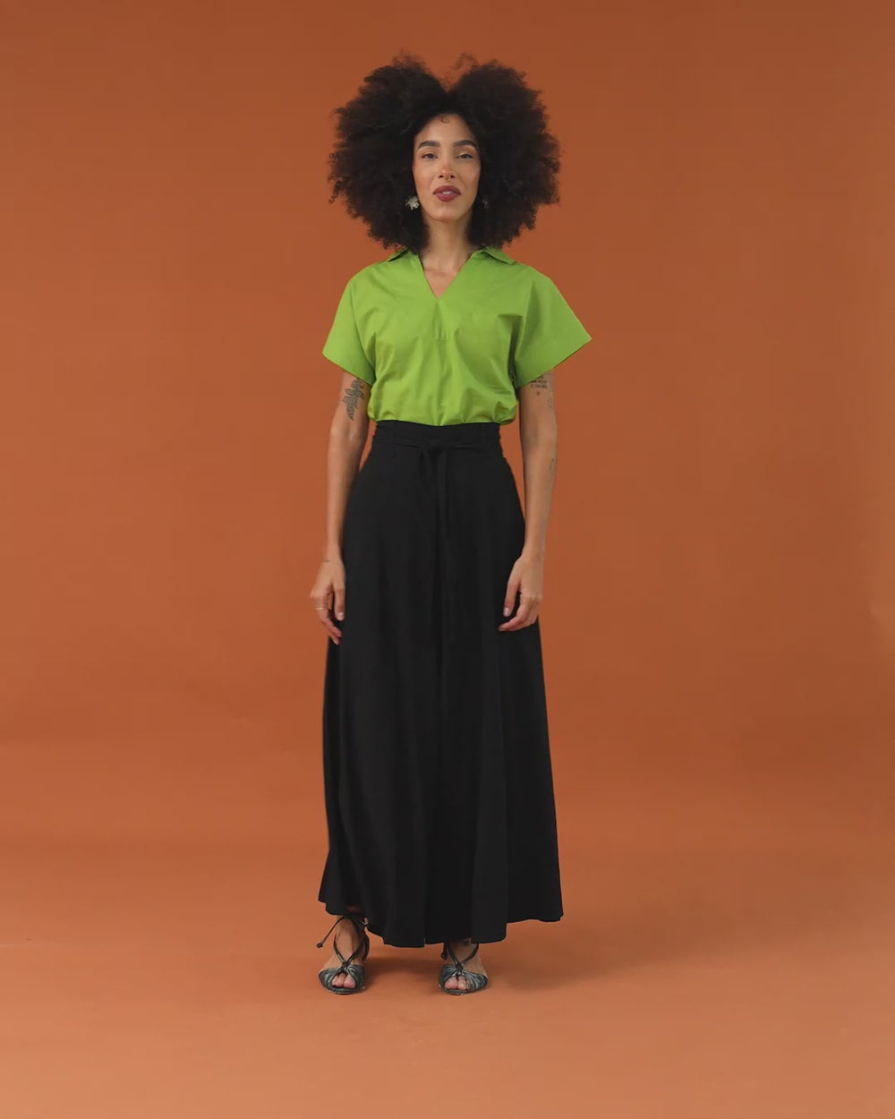 Escolhemos a viscose por ser um tecido leve e ideal para dias quentes. Ela permite que o corpo respire sem causar desconforto.