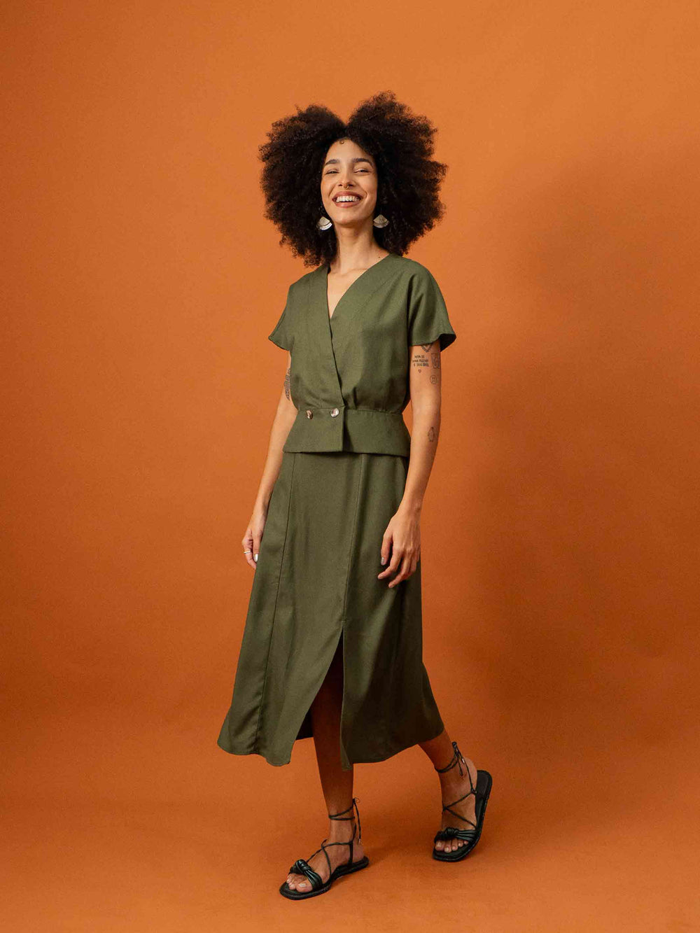 A Saia Agatha tem uma modelagem especial com recortes que valorizam o corpo. Ela tem elástico na parte de trás que deixa a peça mais ajustável aos diversos tipos de corpos, além de deixar a peça bem confortável. ✨ Tem bolsos pra deixar a peça funcional, e o mais lindo dela é a fenda frontal❤️