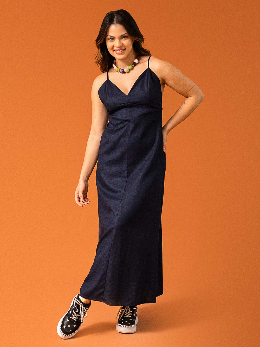 A modelo tem 0 mm de busto x 0 mm de cintura x 0 mm de quadril.