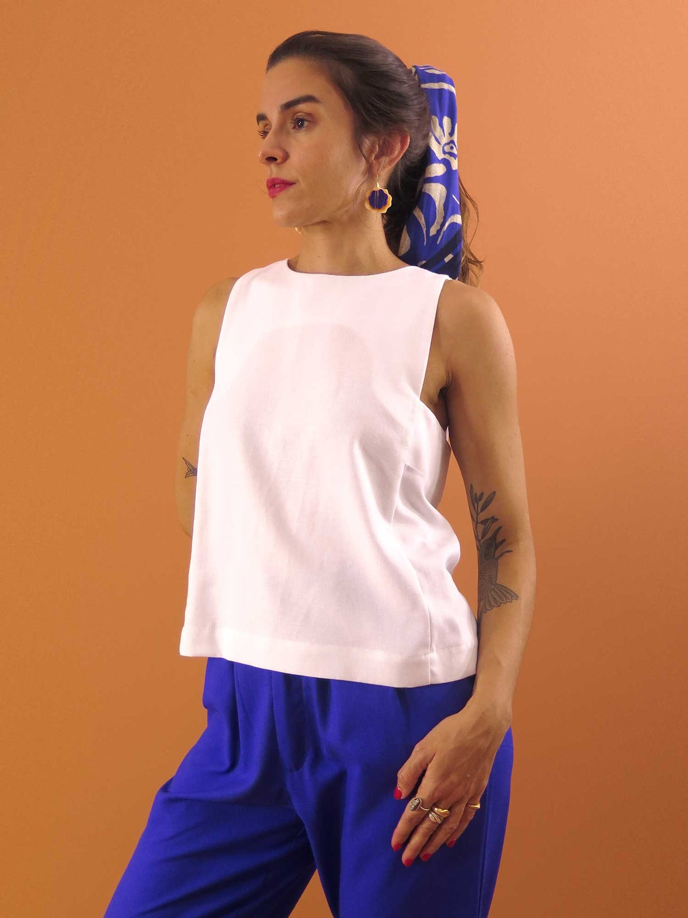 A modelo tem 86 cm de busto x 69 cm de cintura x 98 cm de quadril.
