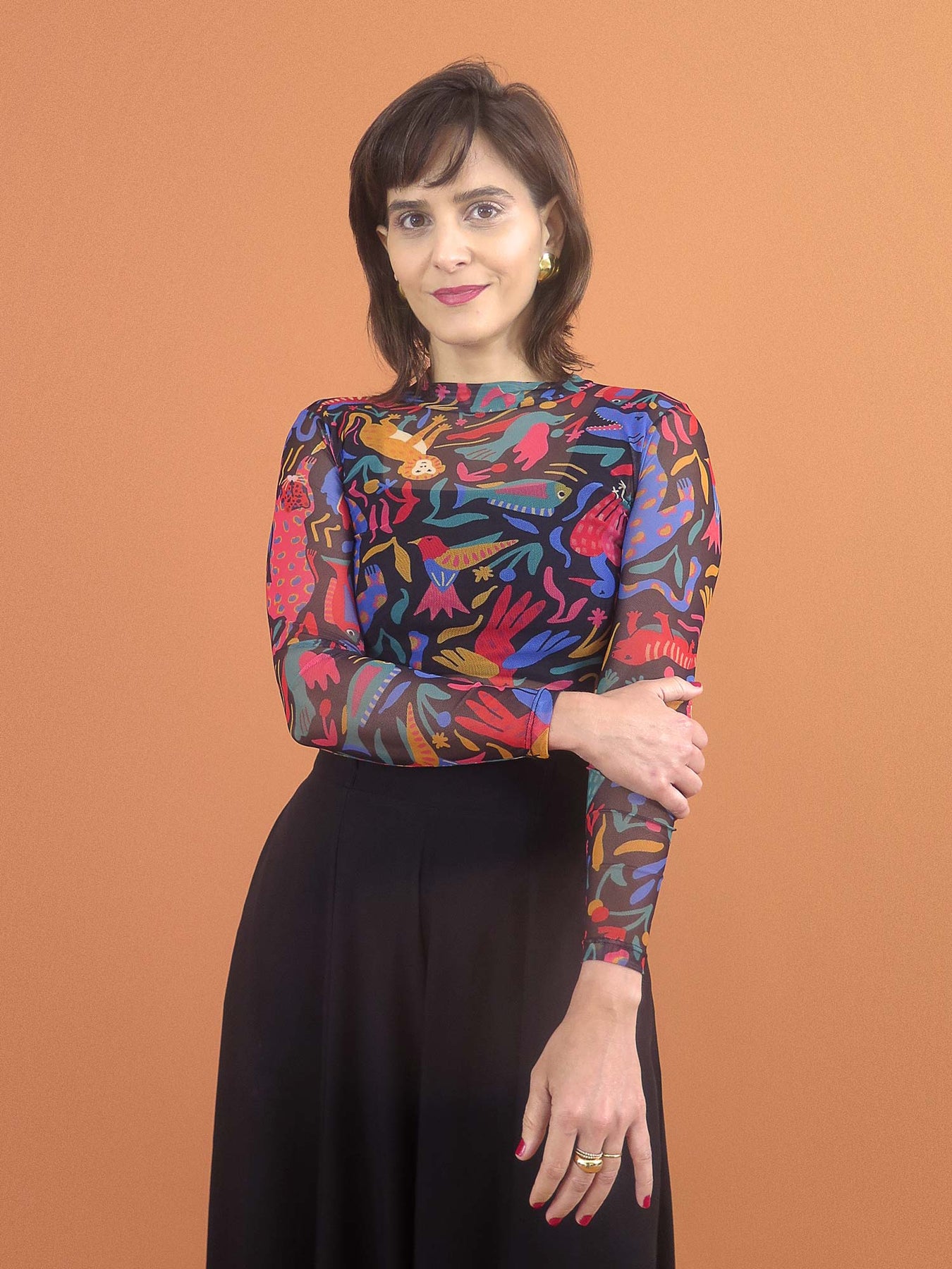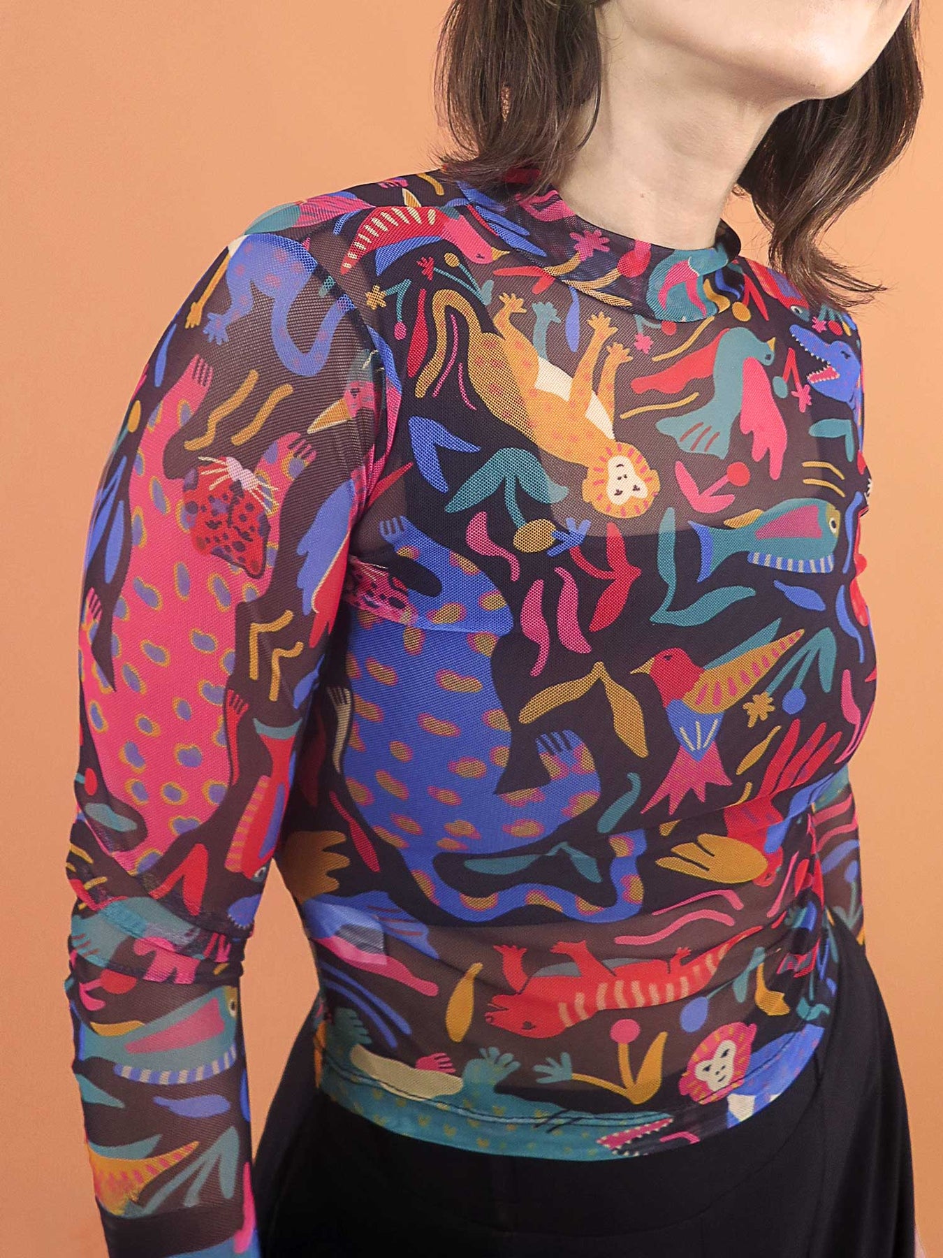 É o Bicho foi criada em 2023, tendo como referência a nossa fauna diversa e tão rica. Estampa cheia de texturas, com um contraste do fundo preto com animais em cores vibrantes e nada óbvias.