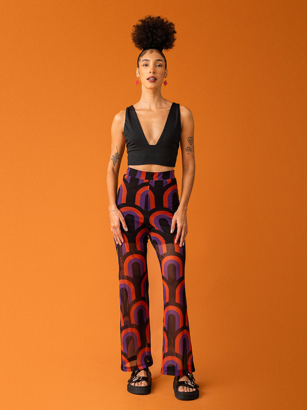 Inspirada nos desenhos gráficos dos papéis de parede das décadas de 60 e 70, essa estampa traz curvas simétricas, cores vibrantes e uma atmosfera retrô que a DUAS ama.