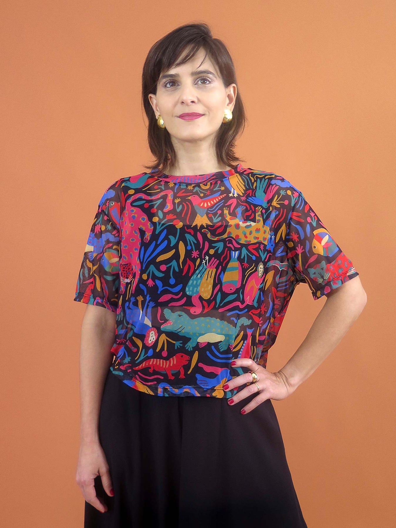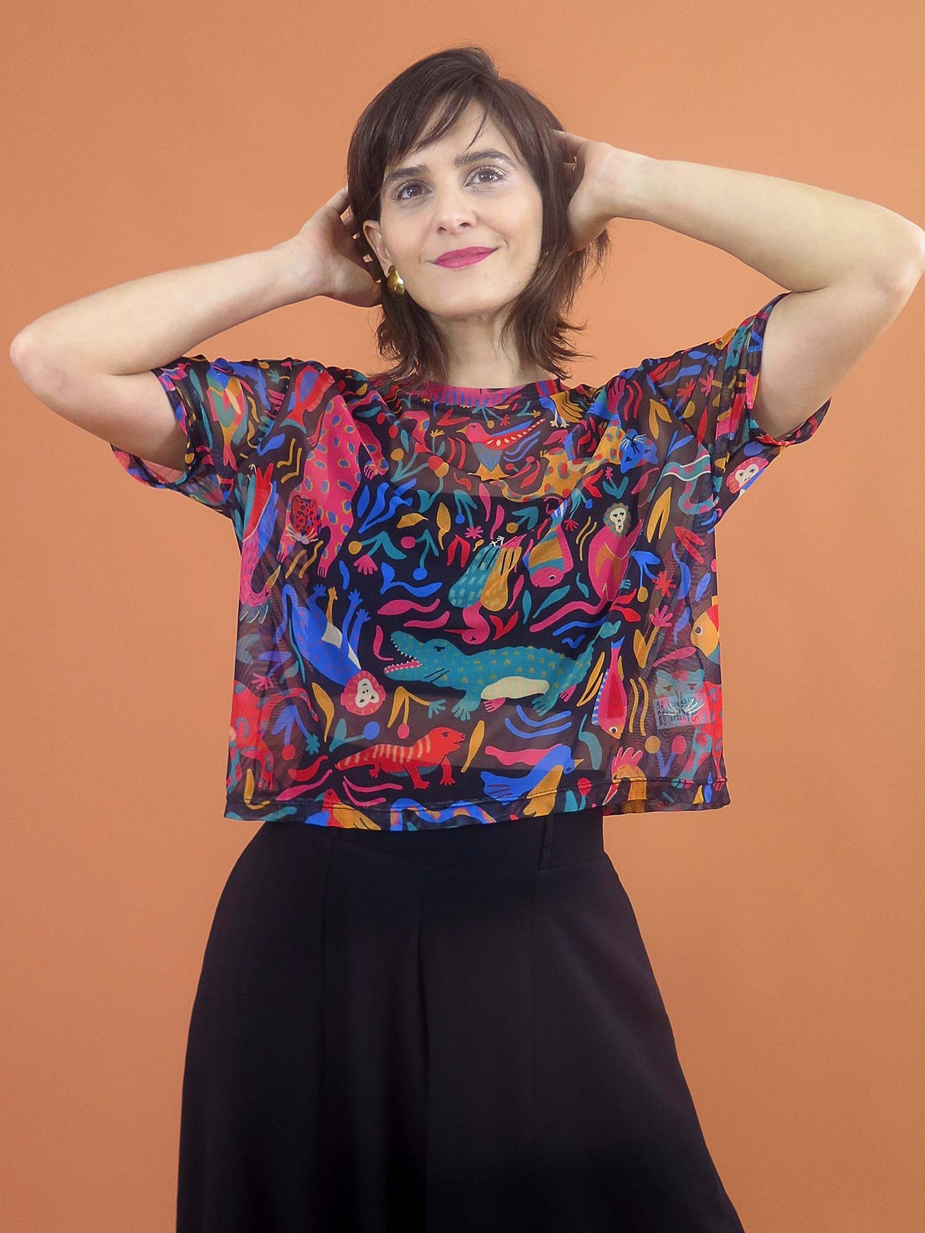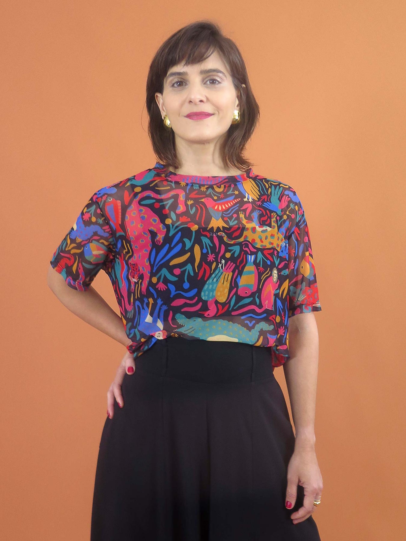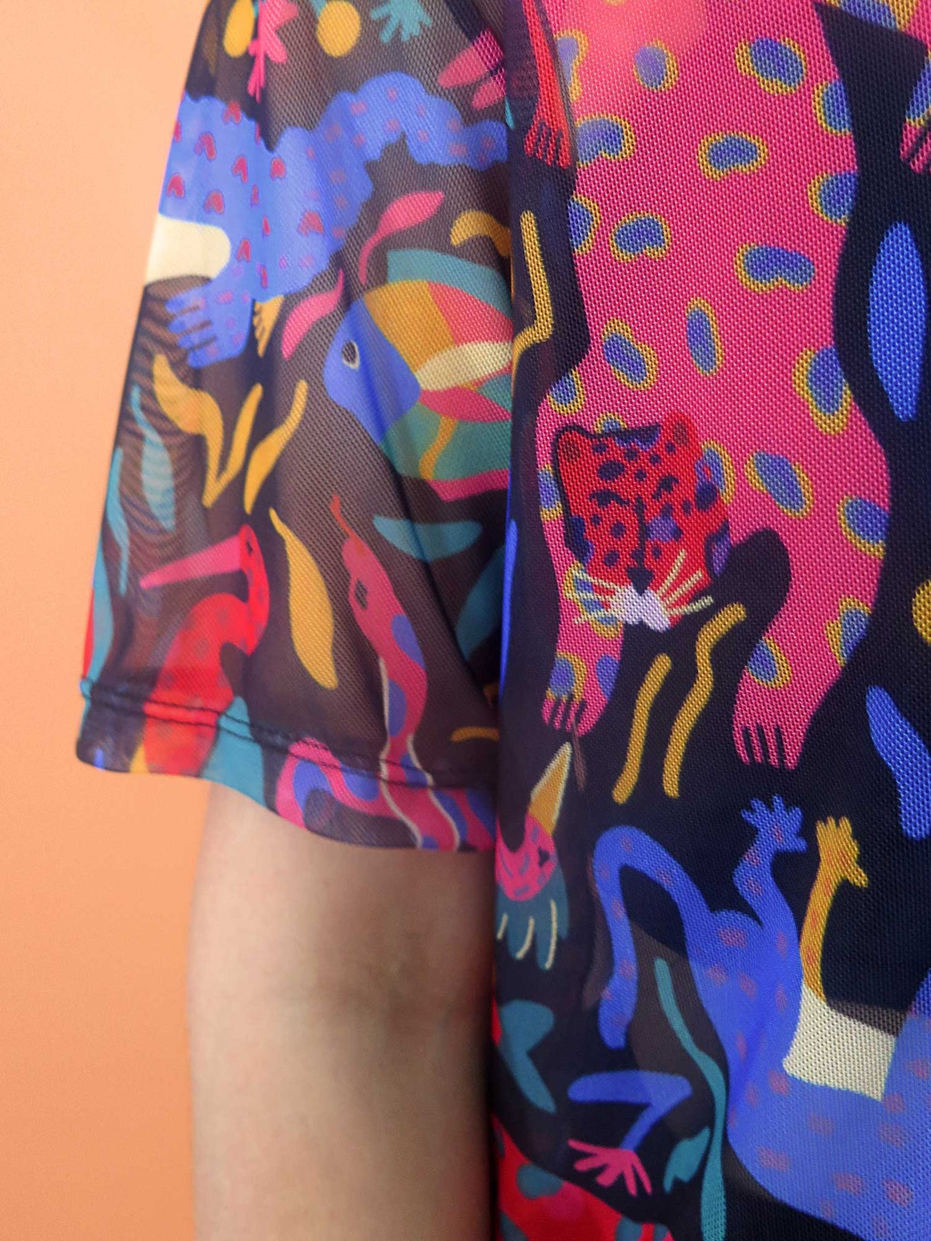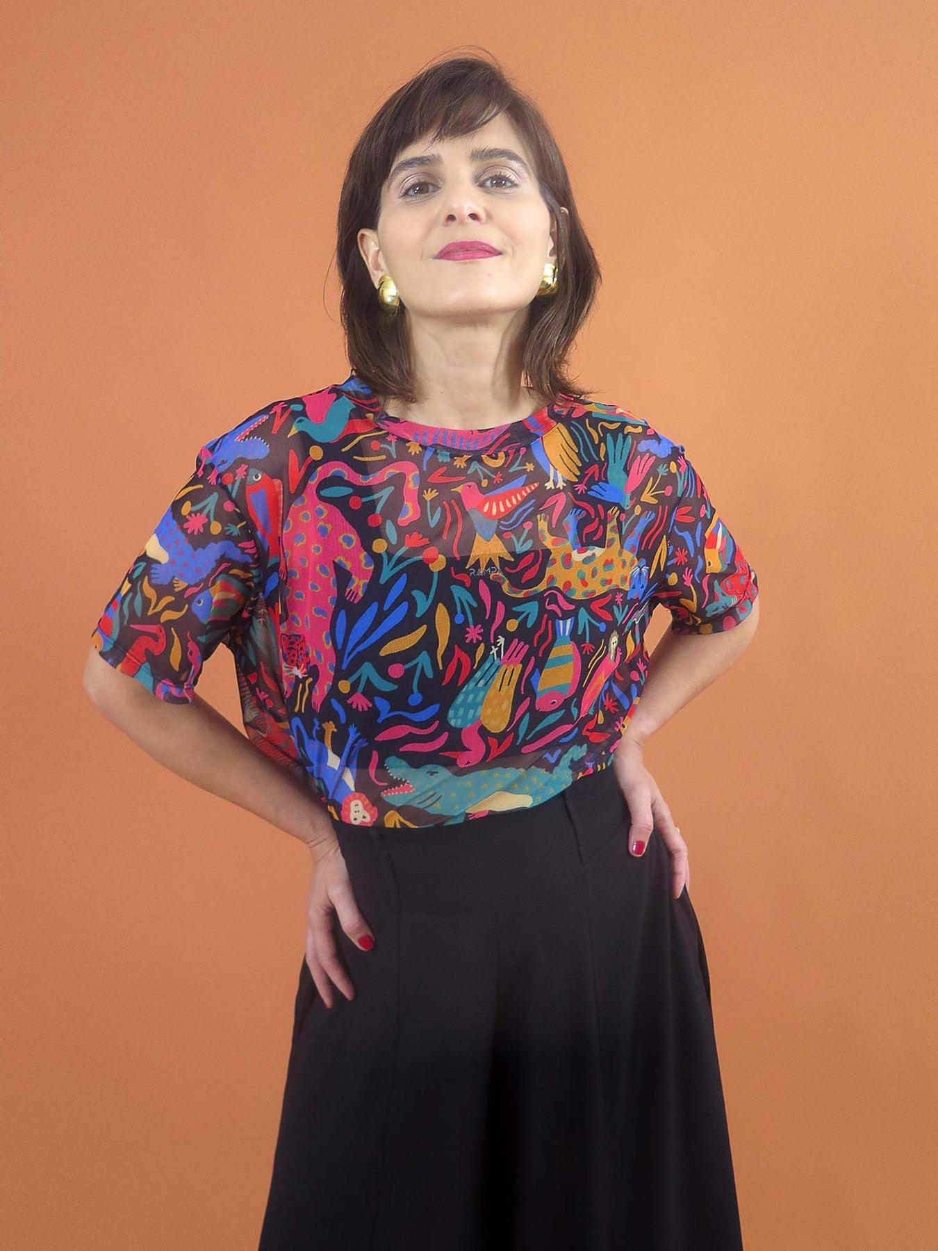 É o Bicho foi criada em 2023, tendo como referência a nossa fauna diversa e tão rica. Estampa cheia de texturas, com um contraste do fundo preto com animais em cores vibrantes e nada óbvias.