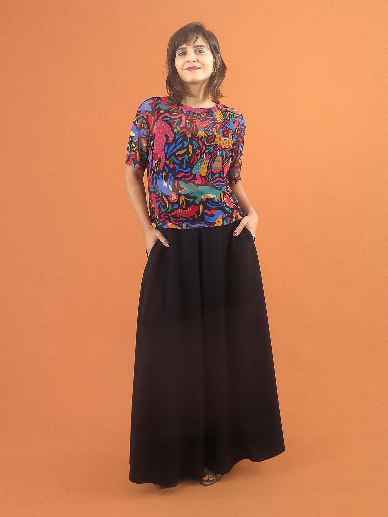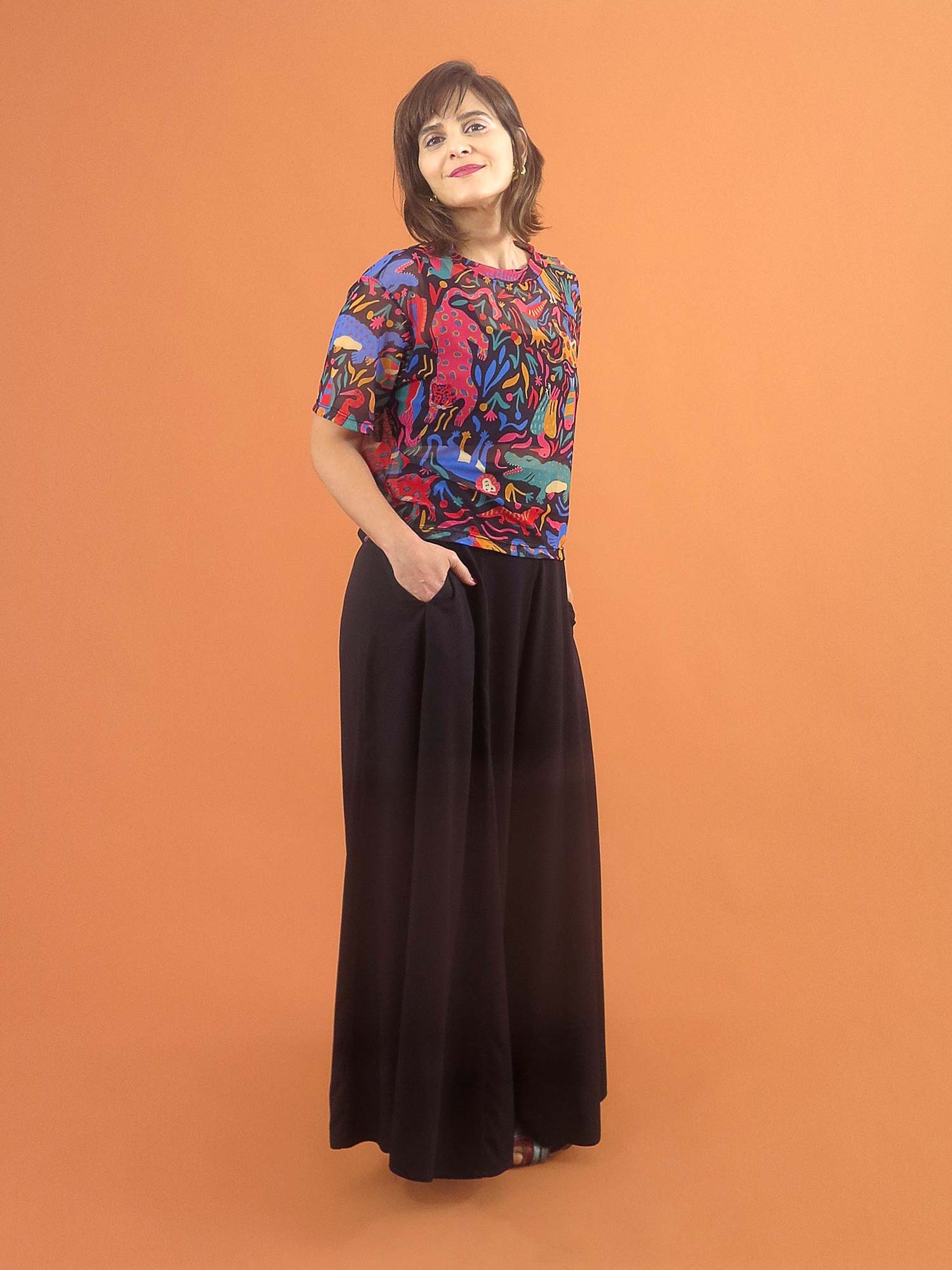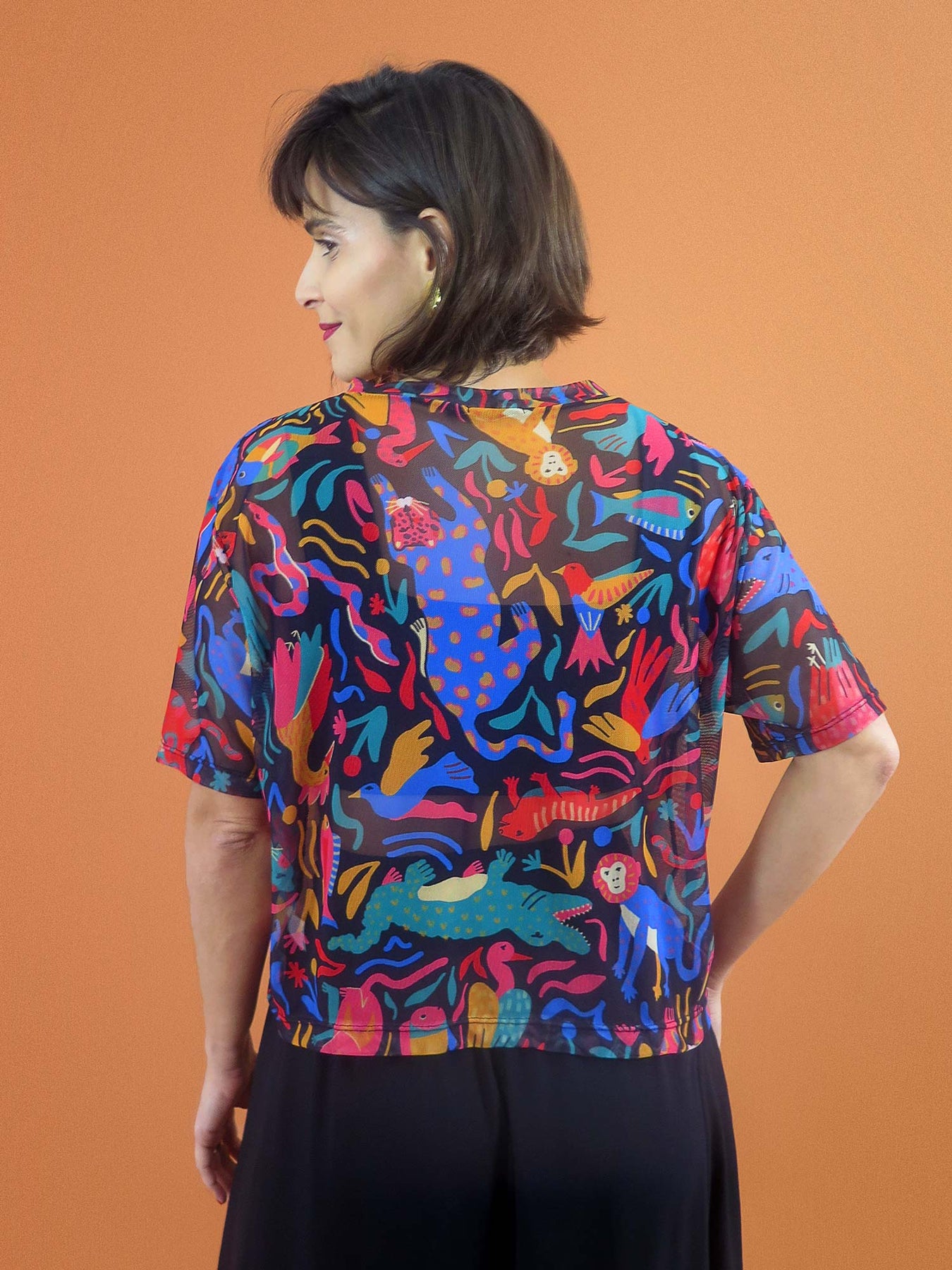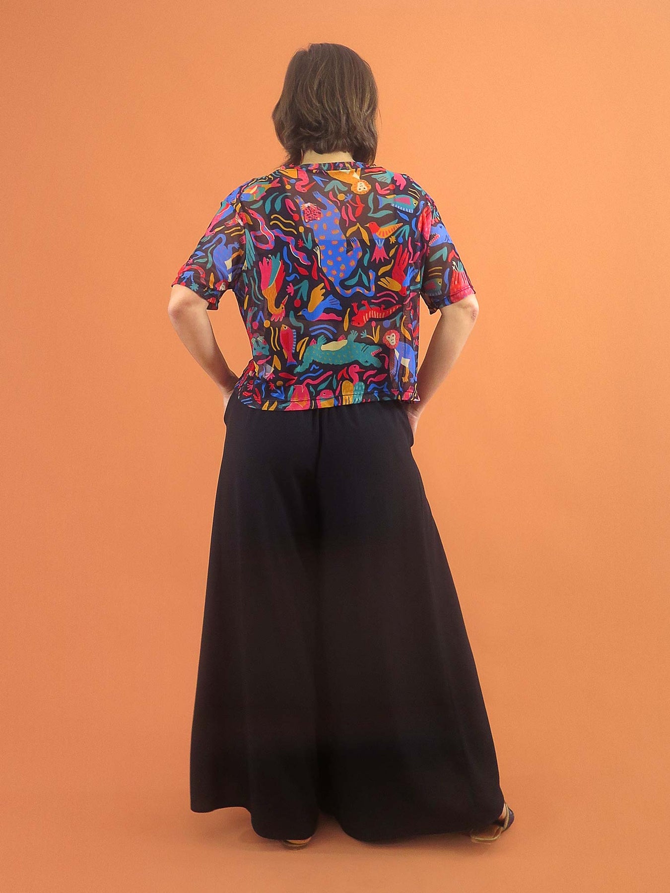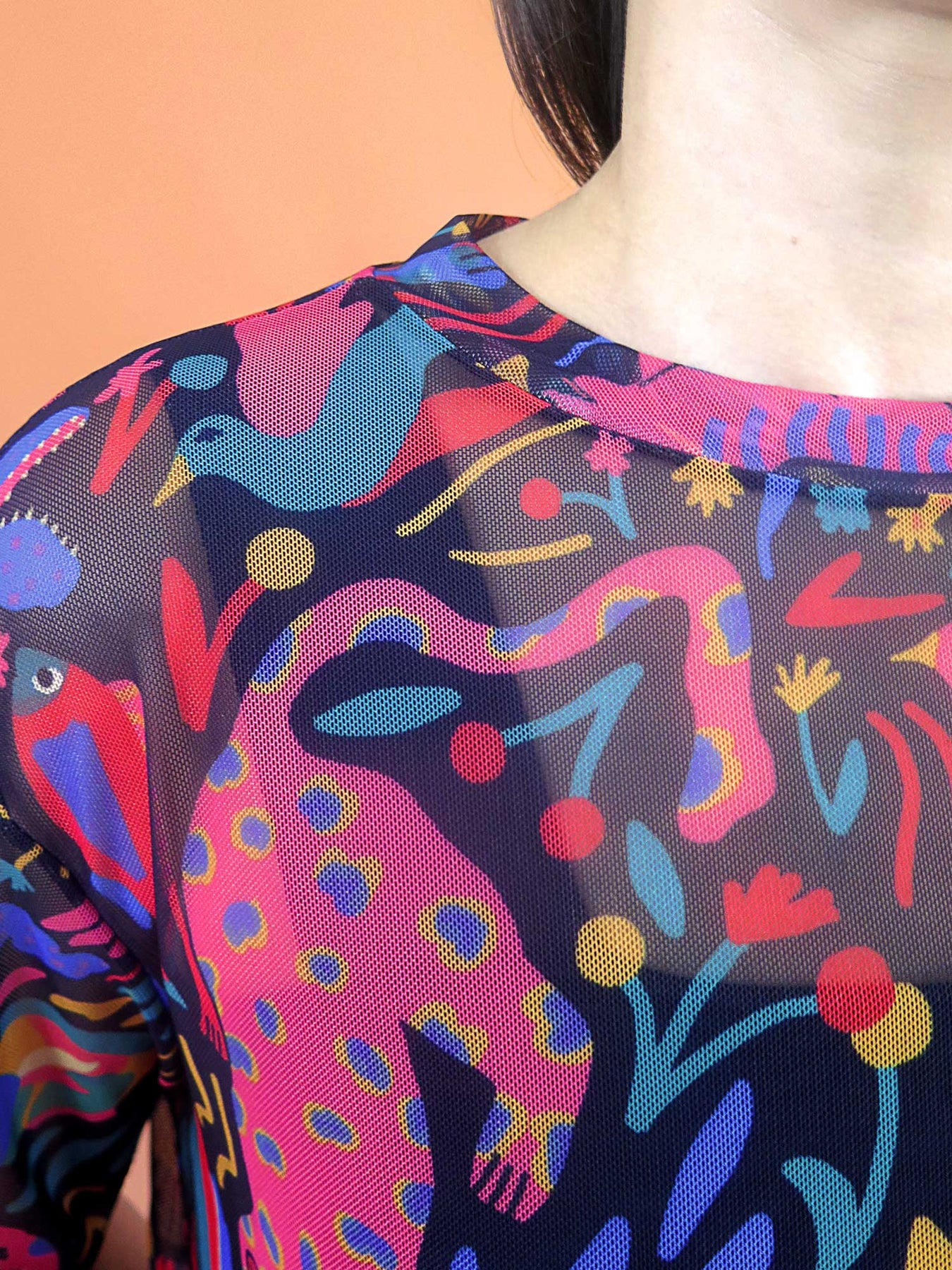 É o Bicho foi criada em 2023, tendo como referência a nossa fauna diversa e tão rica. Estampa cheia de texturas, com um contraste do fundo preto com animais em cores vibrantes e nada óbvias.