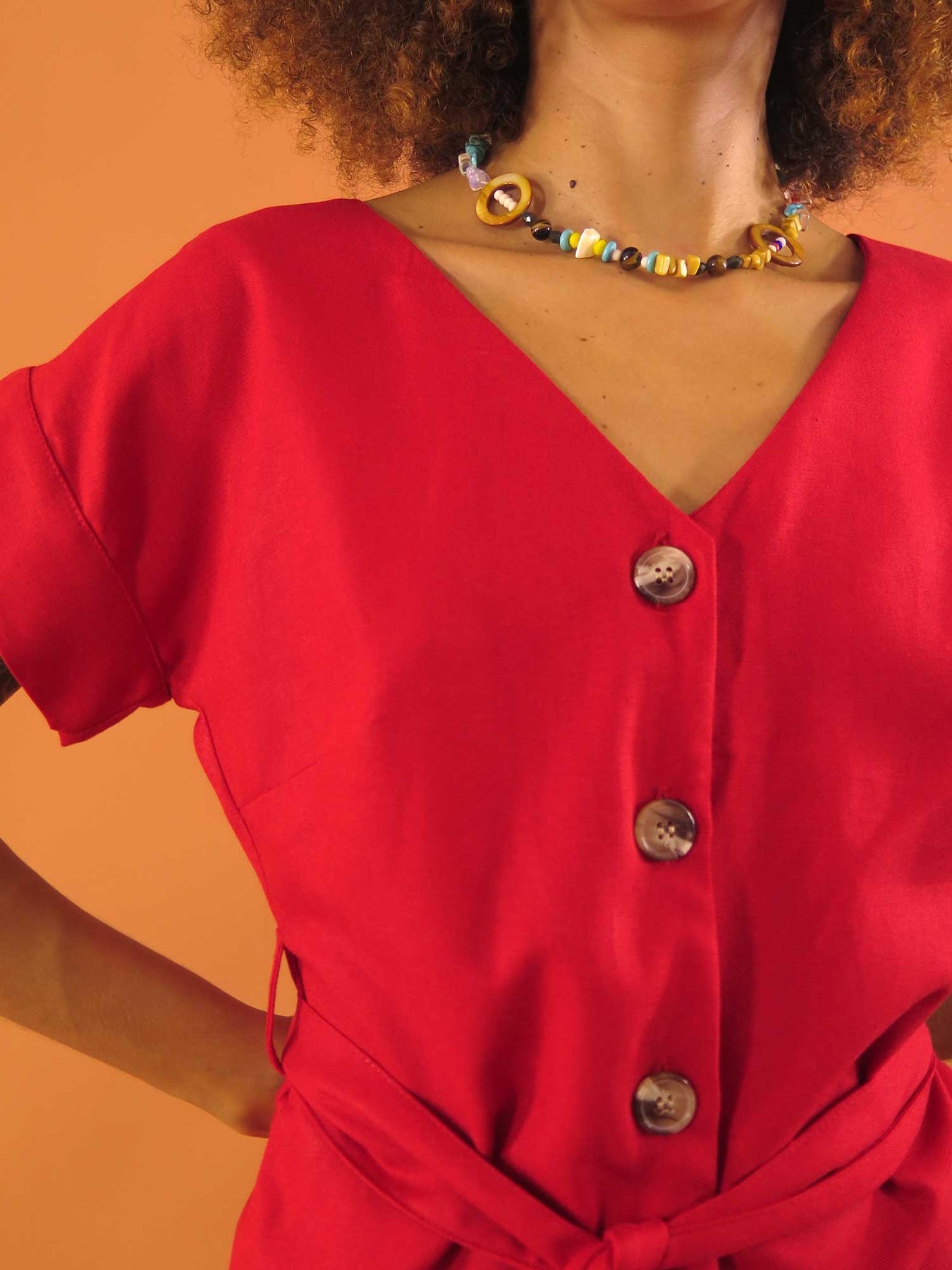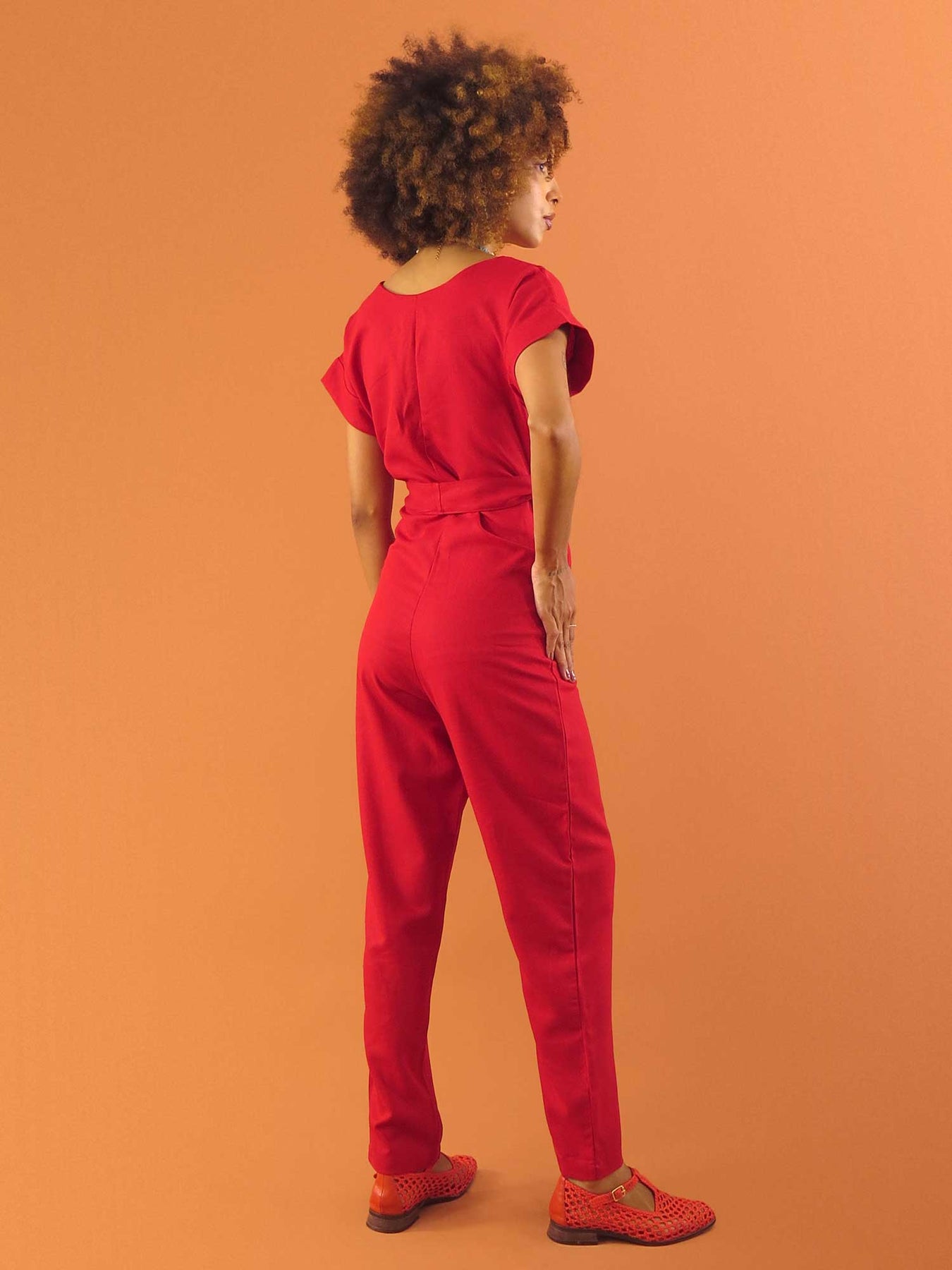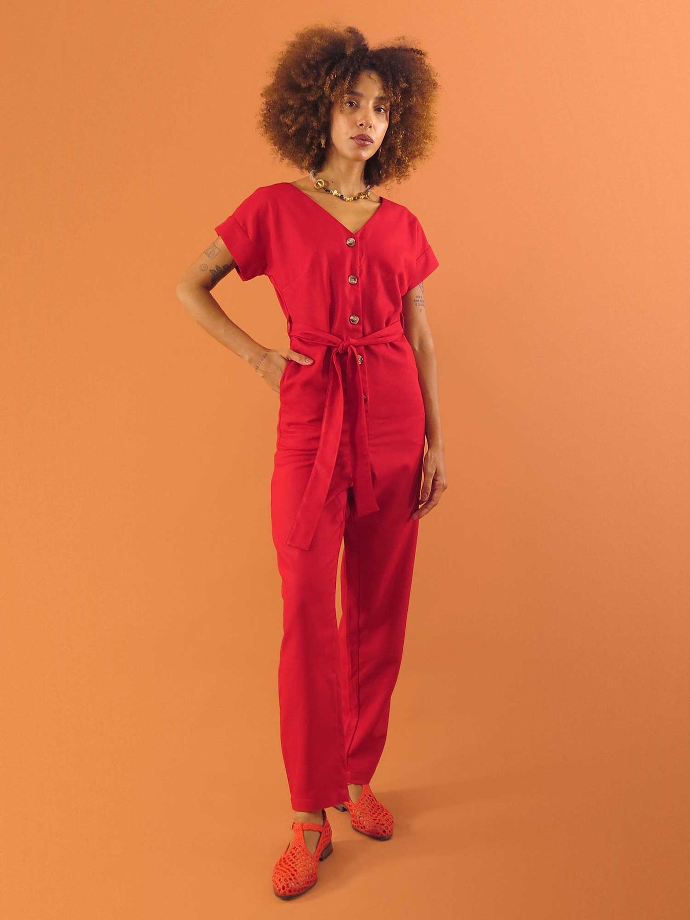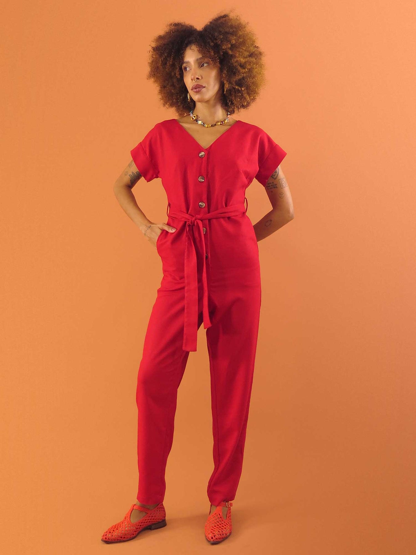 O Macacão Edna é ideal para quem gosta de uma peça soltinha, sem abrir mão de uma modelagem acinturada. Tem fechamento por botões (ótimo para lactantes ♥️), bolsos faca e faixa removível para ajustar a cintura. A dobra na manga traz um charme especial. Versátil, combina com tênis, rasteira ou salto, perfeito para o dia a dia ou ocasiões especiais ✨