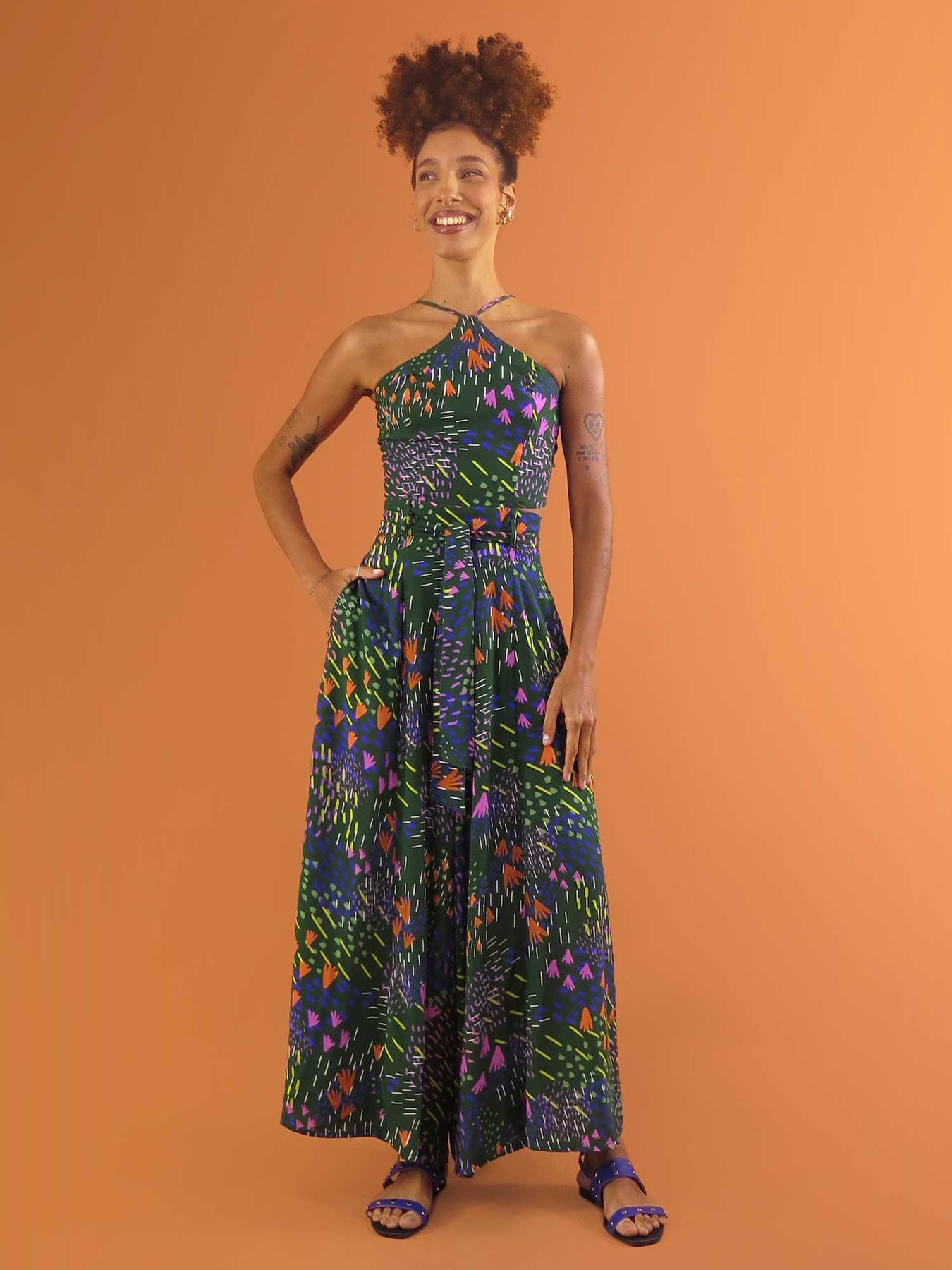 Cada flor parece brotar do movimento dos riscos — pequenas, delicadas, mas cheias de vida. É um convite para desacelerar, como um domingo, sentir o tempo passar devagar e se vestir da nossa natureza colorida.