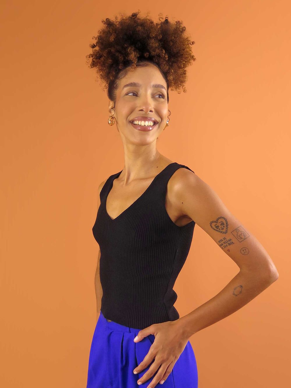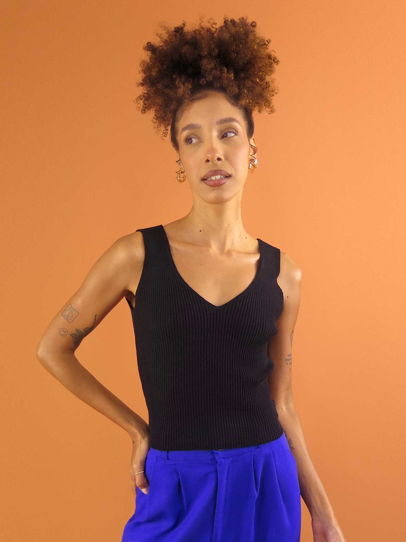 A Regata Bianca é daquelas peças que valorizam o corpo e combinam com tudo! Com modelagem ajustada que realça as curvas na medida certa, ela é feita em Tricot, garantindo um caimento bonito e elegante. Na cor preta, é um clássico indispensável básica, mas com aquele toque sofisticado que faz toda a diferença no look. Dica de ouro: use com nossas calças de alfaiataria ou saias estampadas, adicione acessórios e monte um visual moderno.