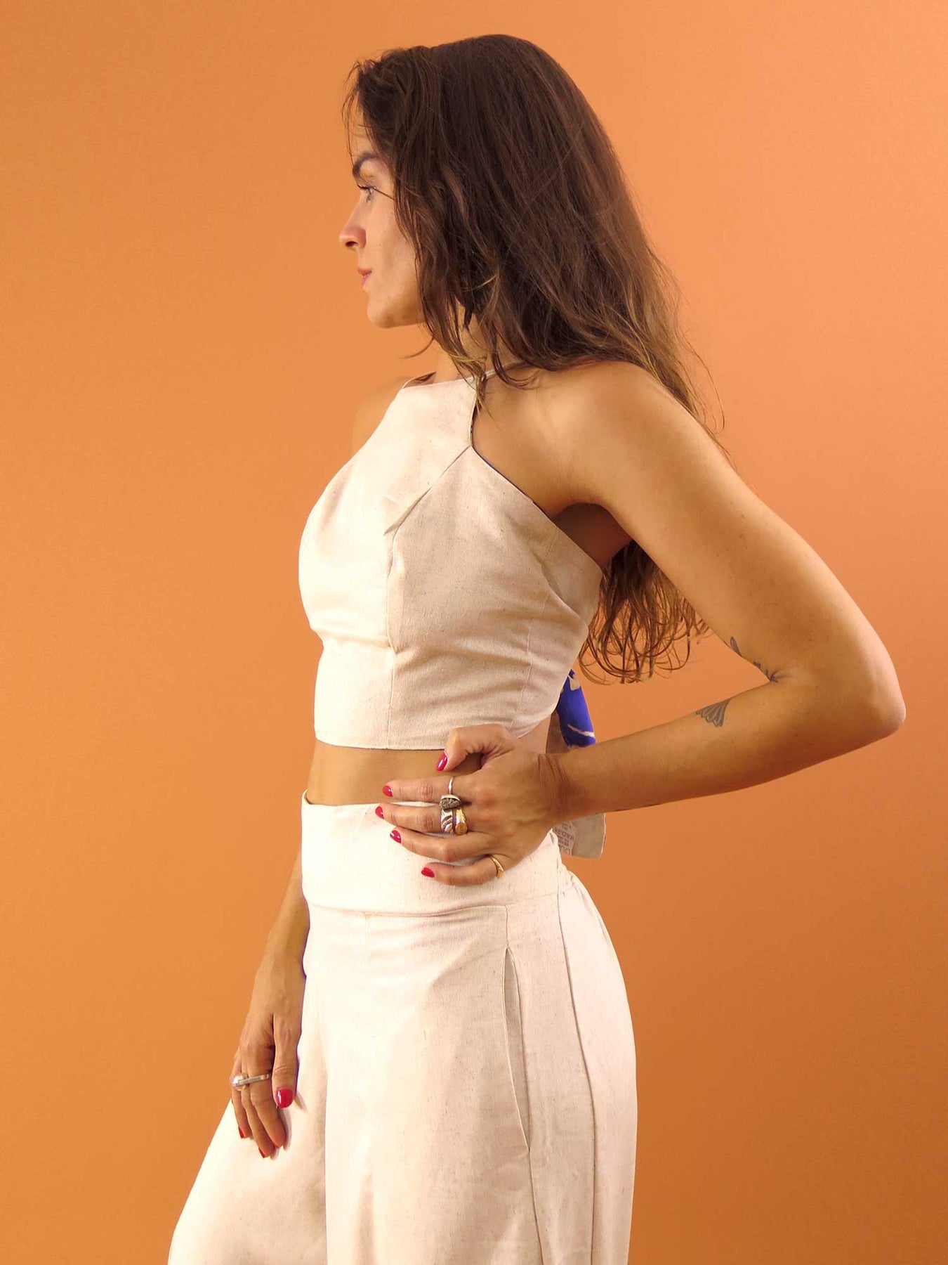 A modelo tem 86 cm de busto x 69 cm de cintura x 98 cm de quadril. Mede 175 cm de altura e veste tamanho PP