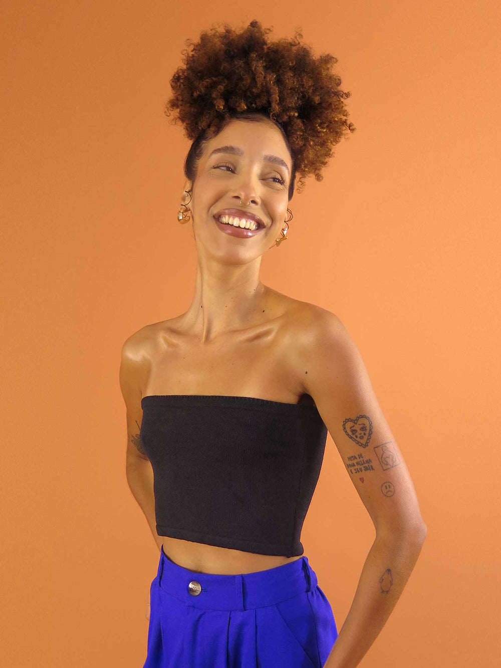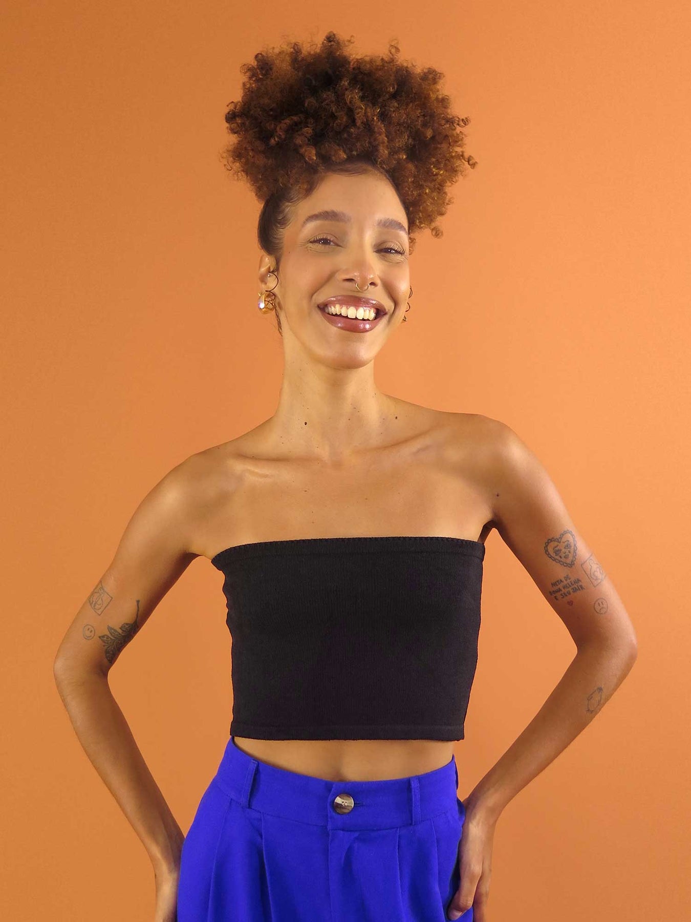 O top Ester é puro conforto e estilo! ✨Na cor Preto e Feito de tricot de viscose e algodão, ele tem modelagem faixa, que se ajusta perfeitamente ao corpo, valorizando a silhueta sem apertar.Um básico indispensável versátil, confortável e cheio de charme perfeito para usar sozinho ou por baixo de camisas, kimonos e blazers.
