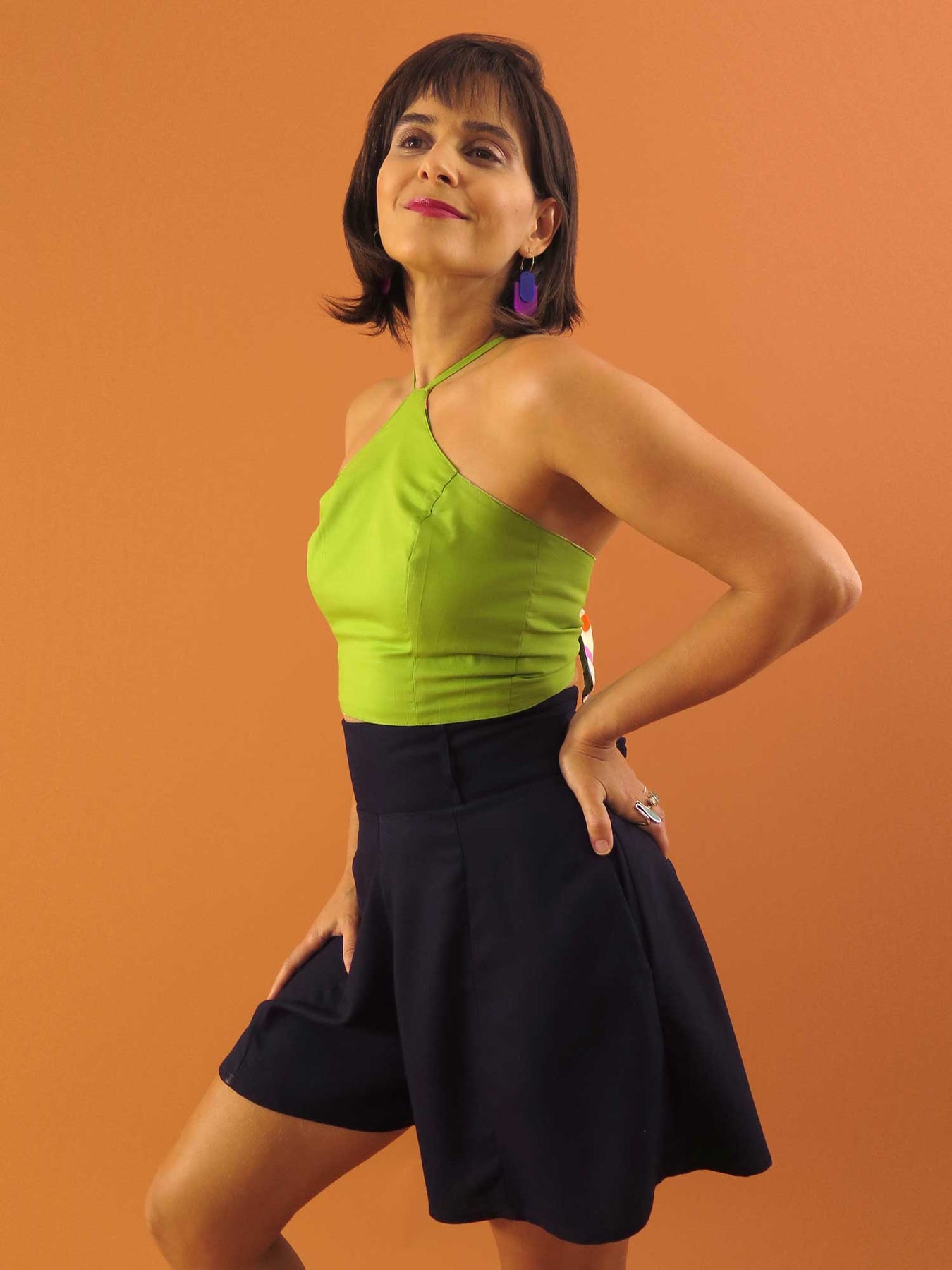 A modelo tem 87 cm de busto x 71 cm de cintura x 101 cm de quadril. Mede 164 cm de altura e veste tamanho PP