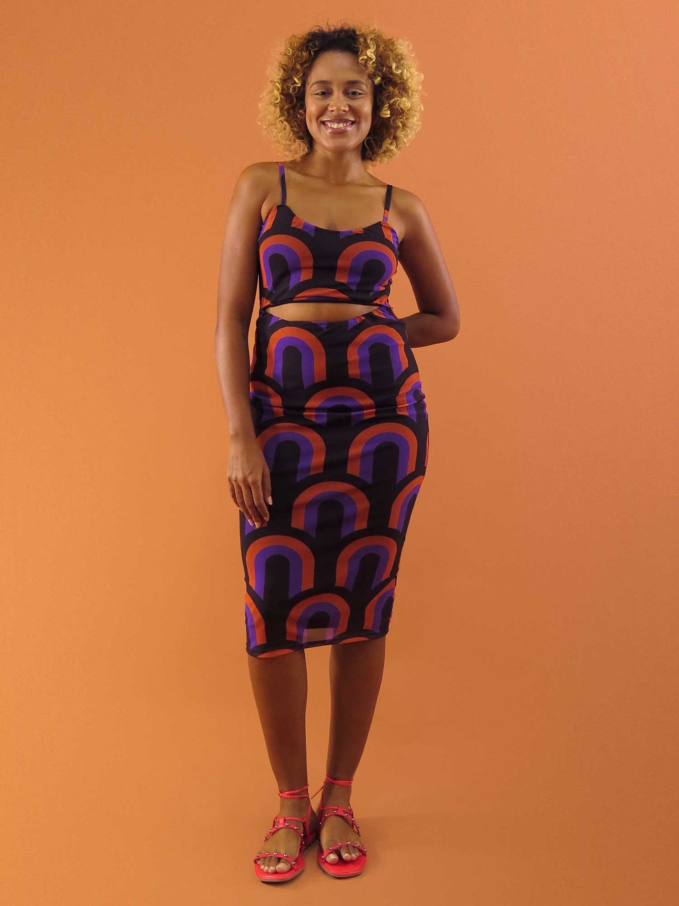 Inspirada nos desenhos gráficos dos papéis de parede das décadas de 60 e 70, essa estampa traz curvas simétricas, cores vibrantes e uma atmosfera retrô que a DUAS ama.