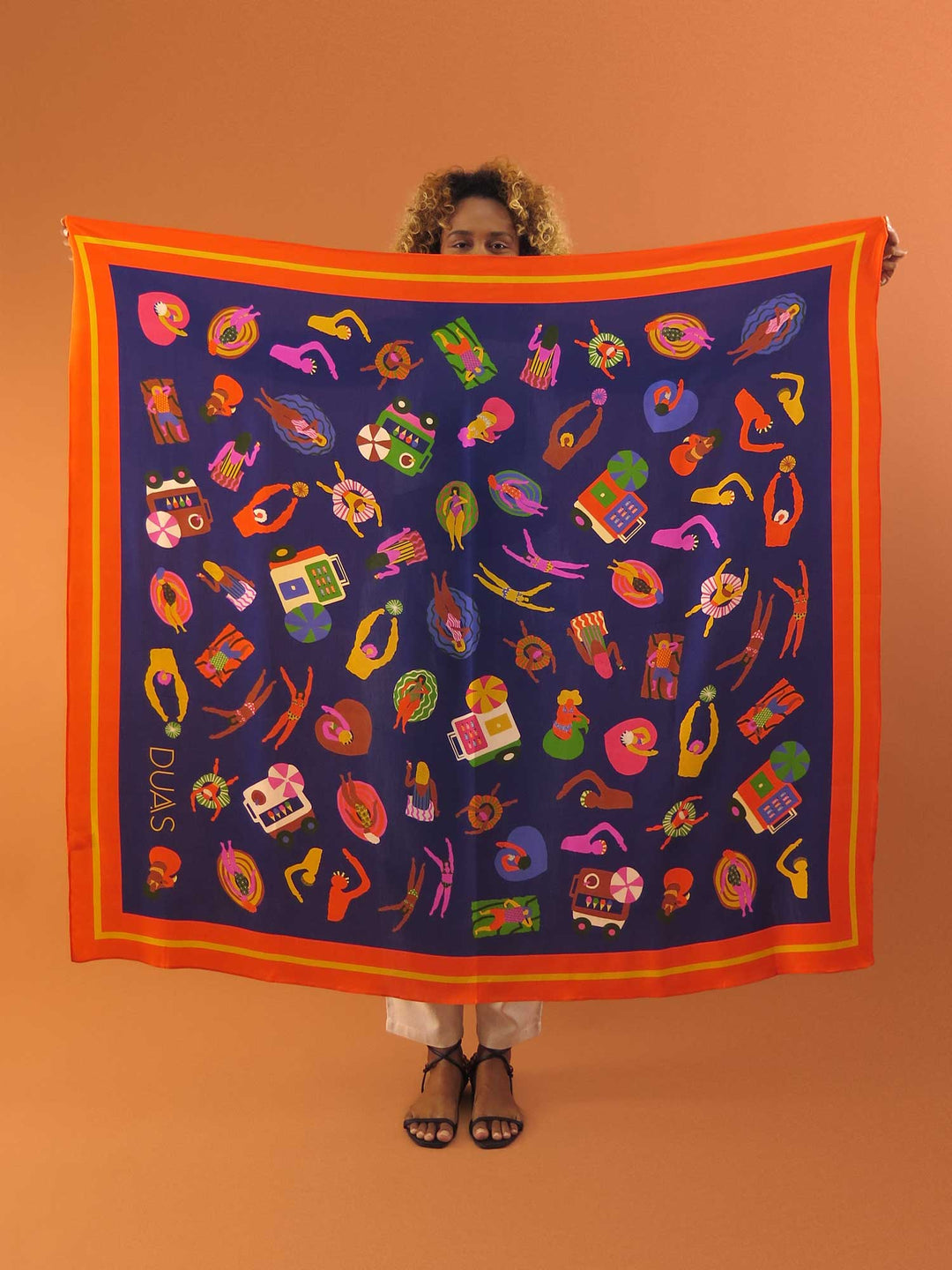 A estampa Quermesse se inspira nas festas populares que misturam o sagrado e o profano e tomam conta das cidades do interior de Pernambuco, especialmente no ciclo junino.