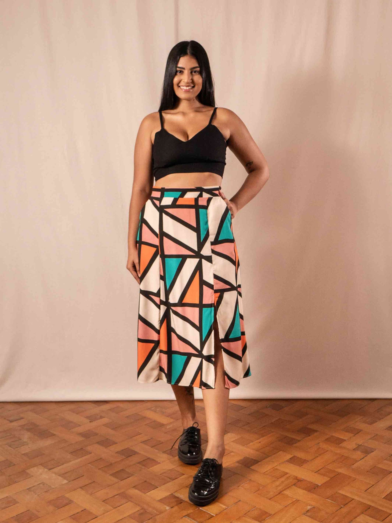 Saia midi estampada alegre e colorida, tem uma modelagem com recortes pensados para valorizar o corpo, elástico na parte de trás que deixa a peça mais ajustável aos diversos tipos de corpos, além de deixar a peça bem confortável. ✨ Tem bolsos pra deixar a peça funcional, e o mais lindo dela é a fenda frontal que deixa a peça toda especial! Precisa falar mais? ❤️