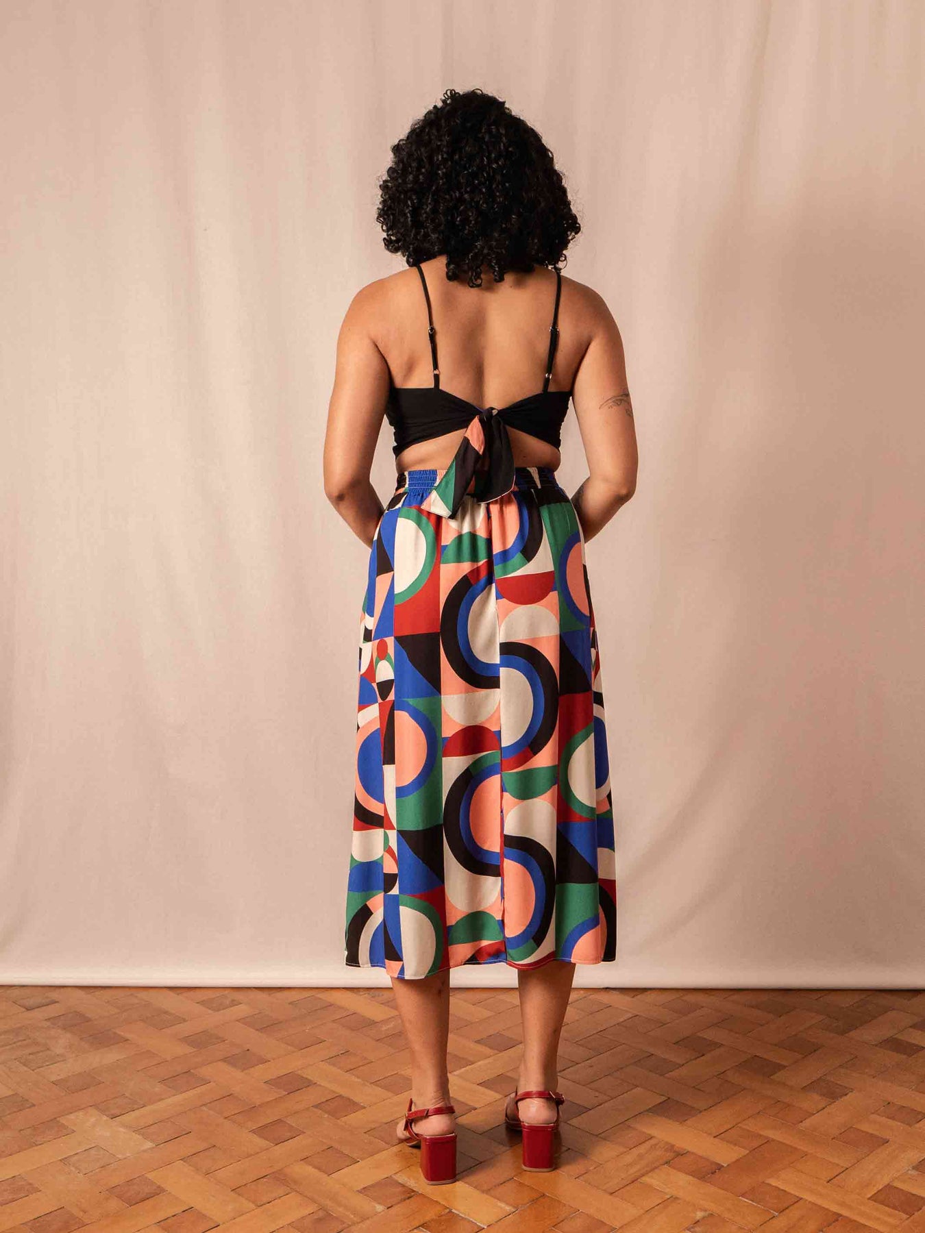 Saia midi estampada alegre e colorida, tem uma modelagem com recortes pensados para valorizar o corpo, elástico na parte de trás que deixa a peça mais ajustável aos diversos tipos de corpos, além de deixar a peça bem confortável. ✨ Tem bolsos pra deixar a peça funcional, e o mais lindo dela é a fenda frontal que deixa a peça toda especial! Precisa falar mais? ❤️