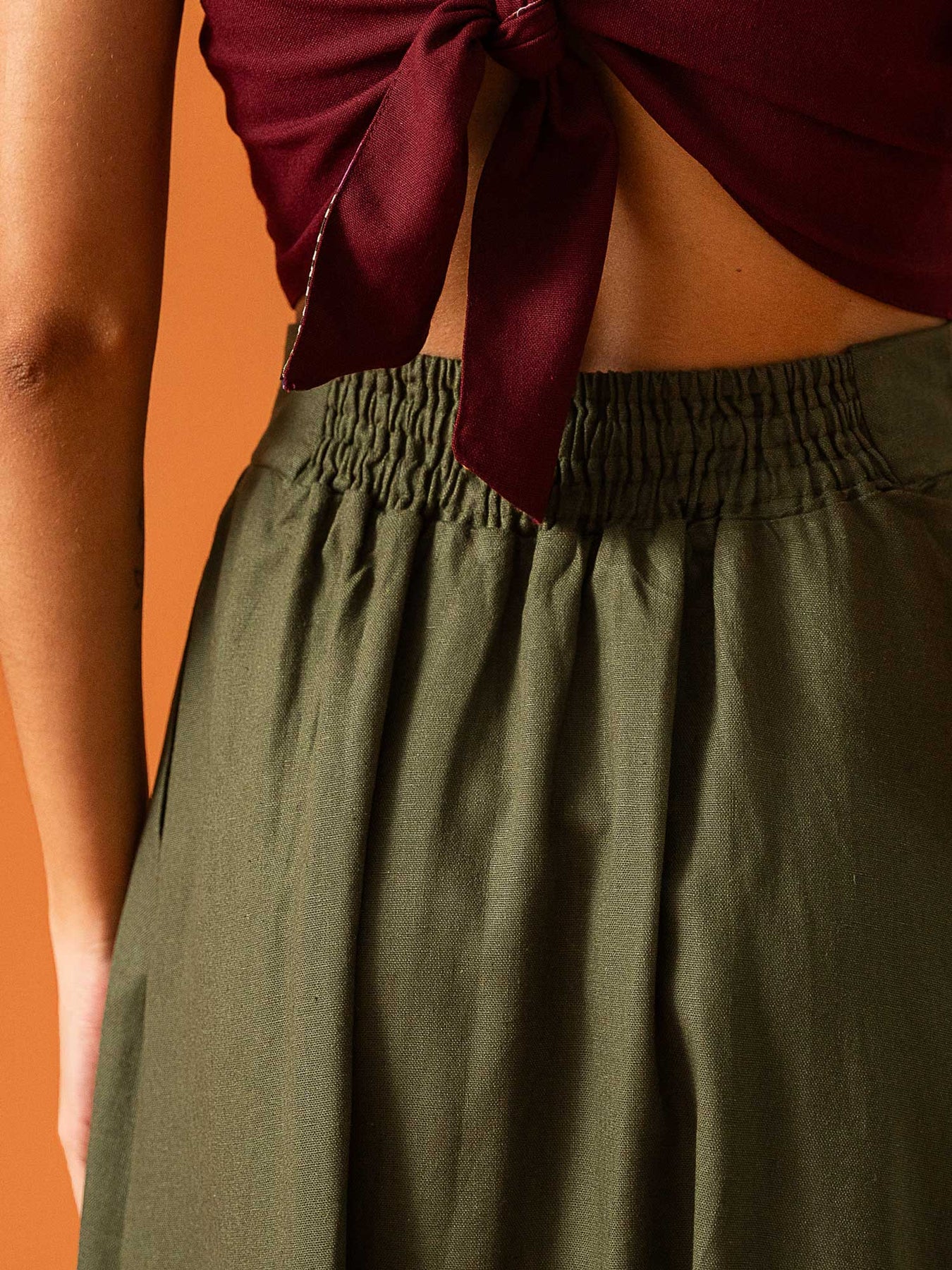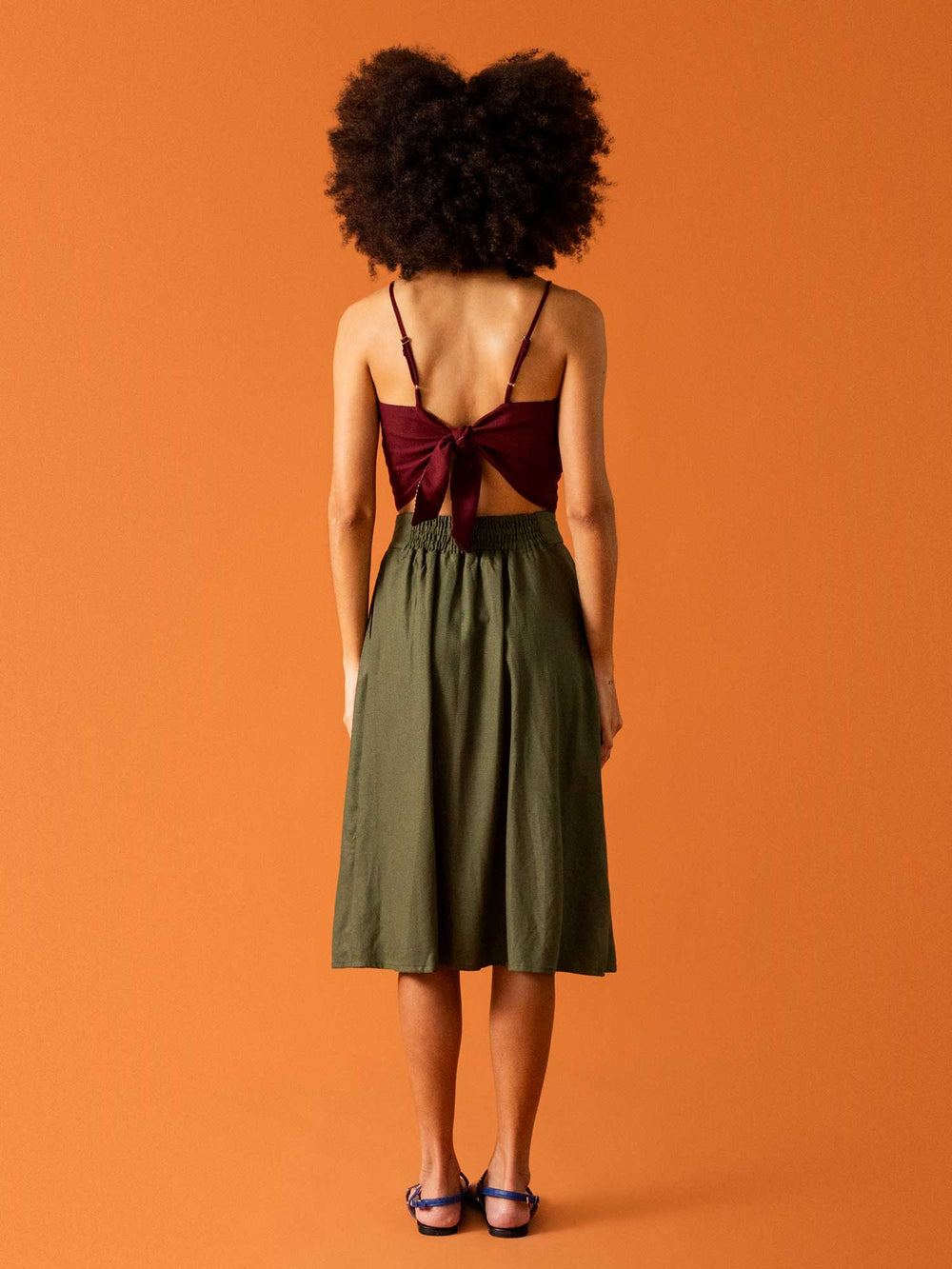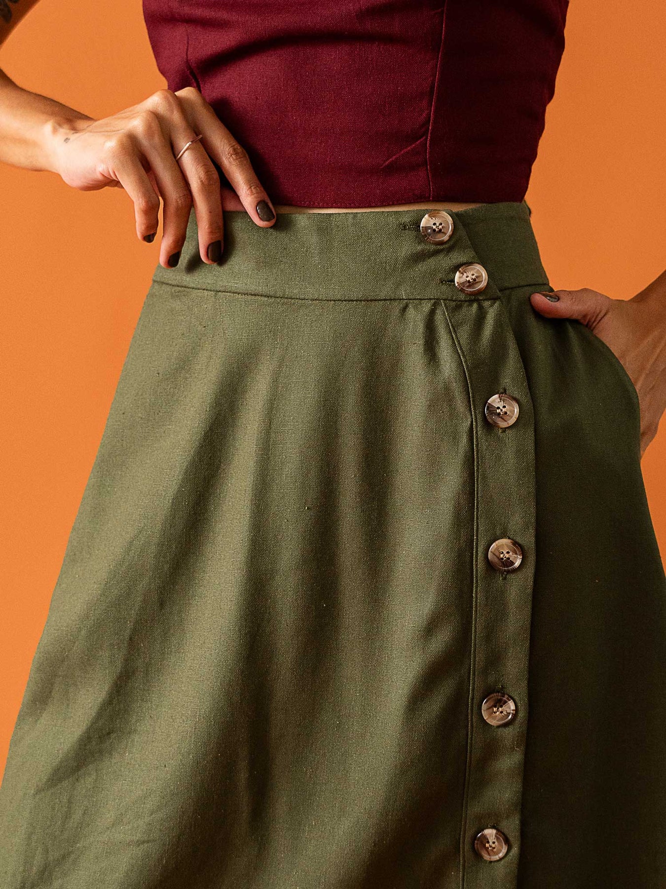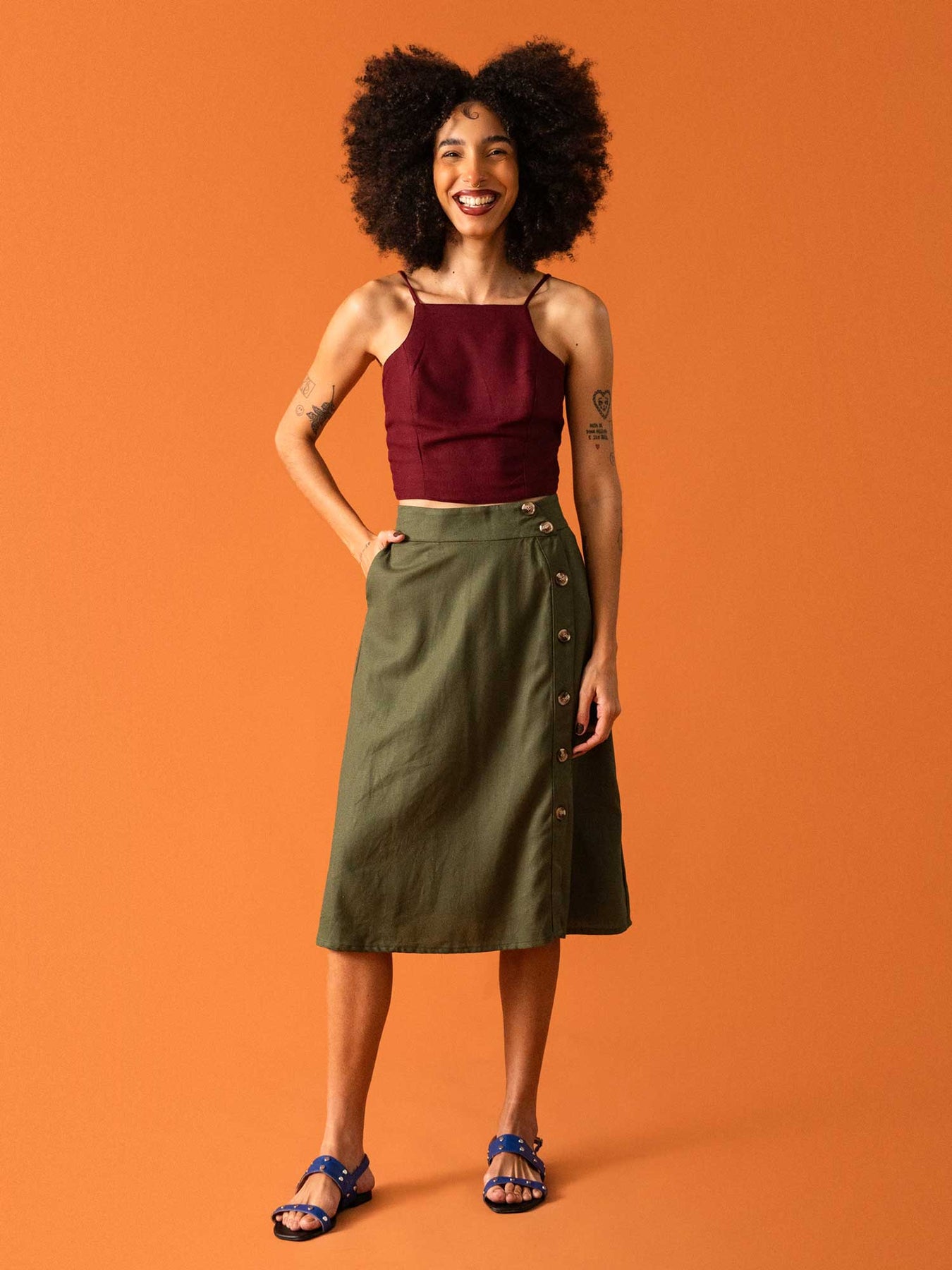 A Saia Dani é super charmosa e versátil! Possui comprimento midi e uma modelagem com fechamento assimétrico em botões. Ainda conta com elástico super confortável na parte de trás e bolsos funcionais. Maravilhosa, não é? ❤️