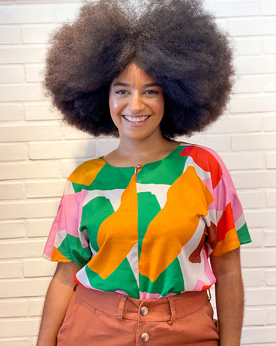 A estampa Samba foi criada por nossa equipe olhando para o trabalho do artista carioca Hélio Oiticica. Fomos buscar inspiração nos seus parangolés e na sua história com a Estação Primeira de Mangueira.