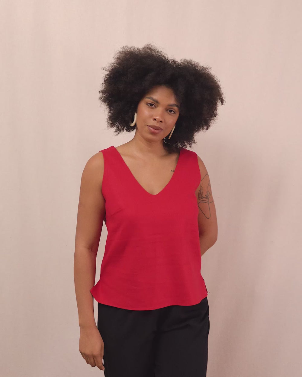 A Regata Manu é perfeita para quem ama peças com um corte mais reto. Possui um decote em formato V bem bonito que valoriza o colo, tanto para quem tem seios maiores ou menores. ✨